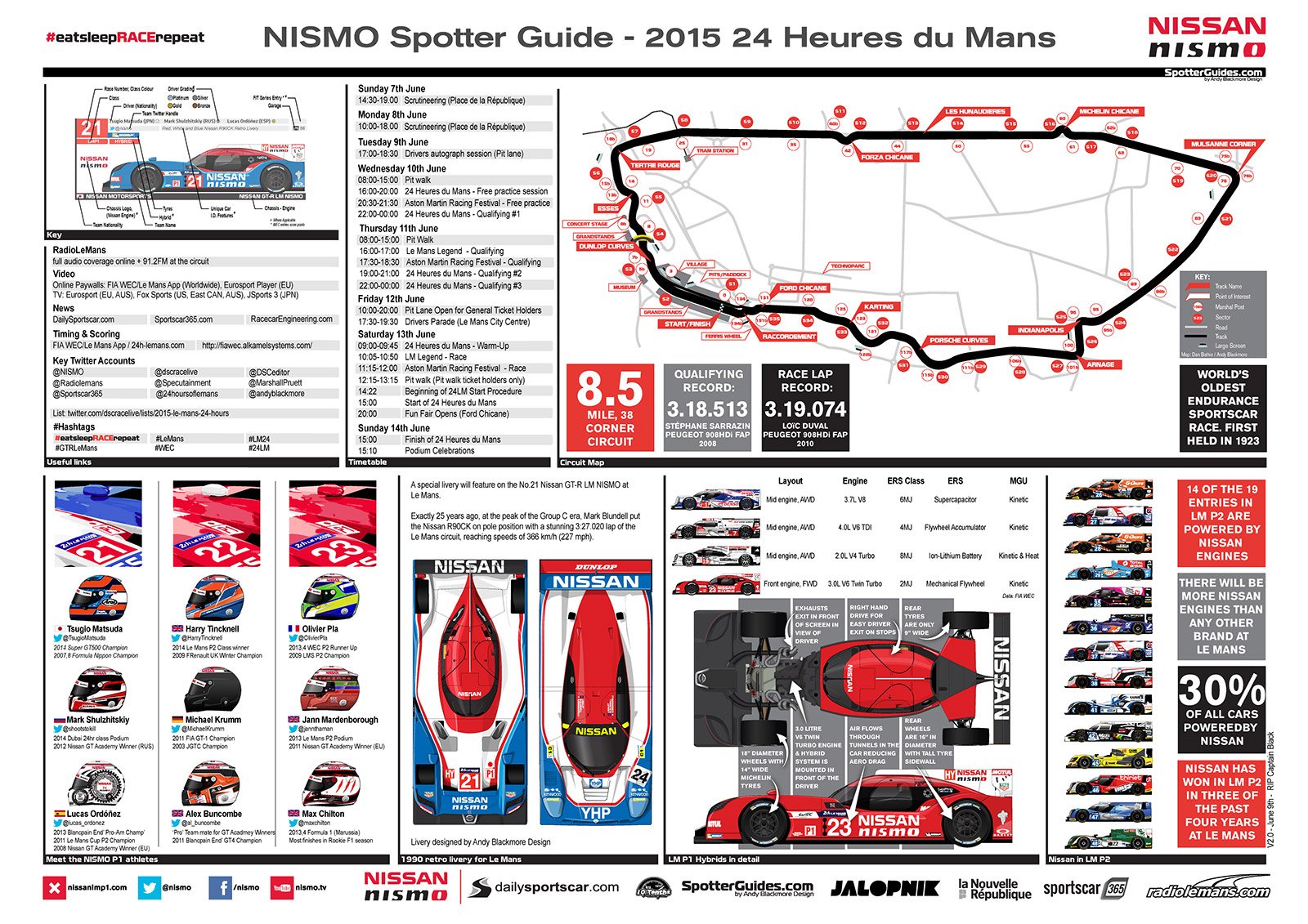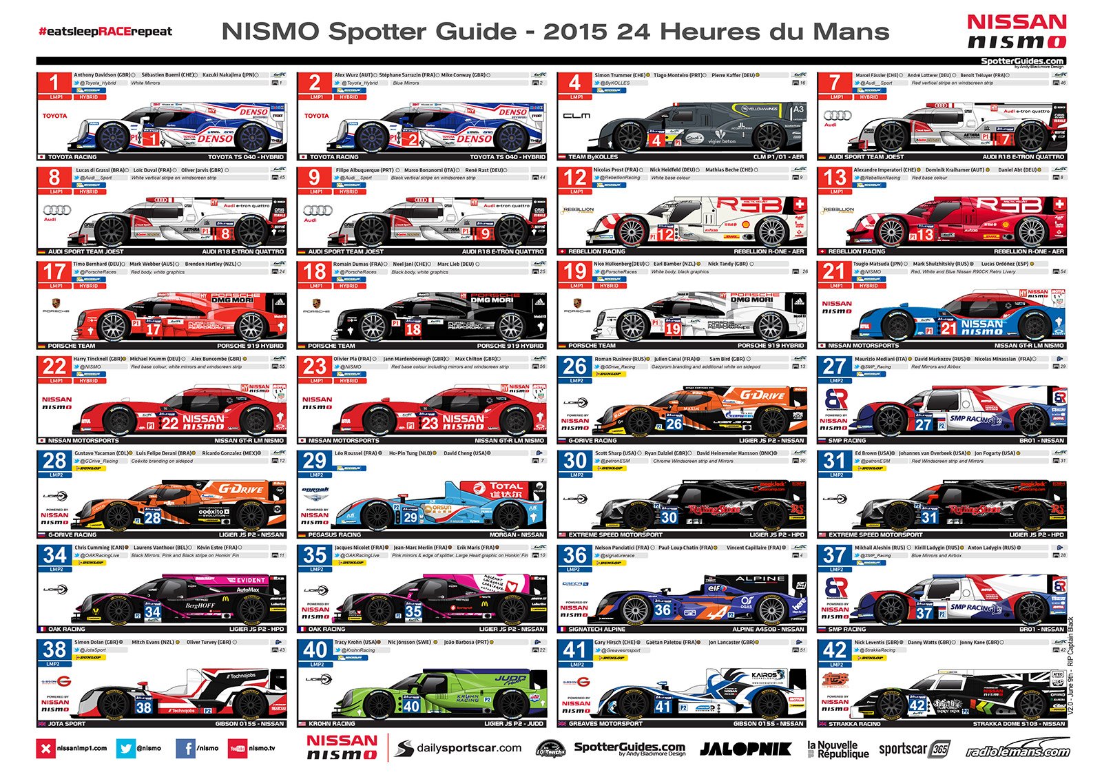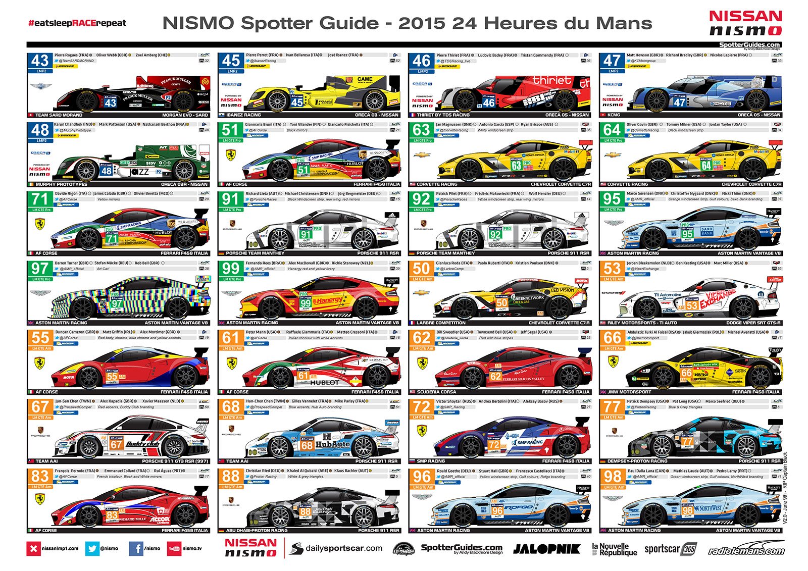 The ‘NISMO Spotter Guide – 2015 24 Heures du Mans’ features all 56 entries and their matching unique liveries for this year’s race. It includes details such as Race Number and Class, Driver and Nationality, Team Name and Nationality, and Chassis and Engine combo. Andy even went as far as to include the Teams’ official Twitter handle so you can follow them as the race goes on.